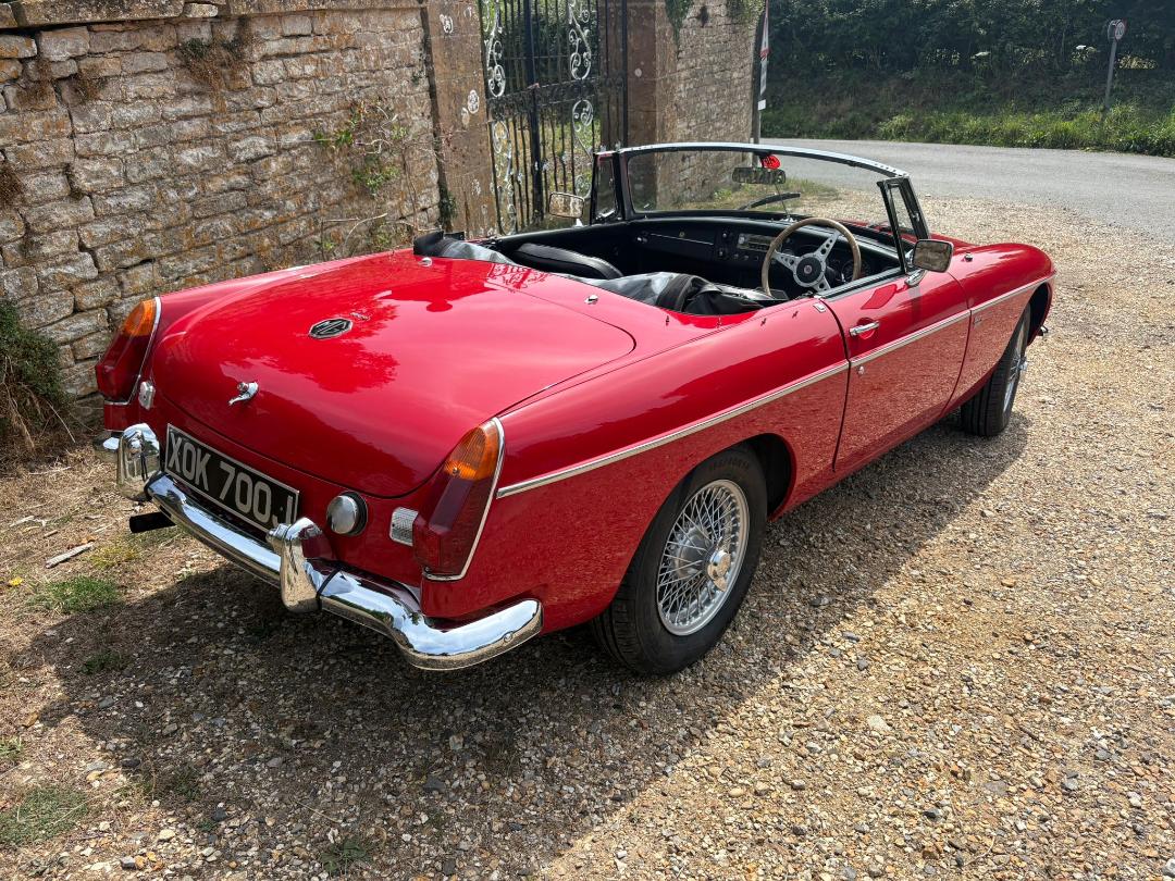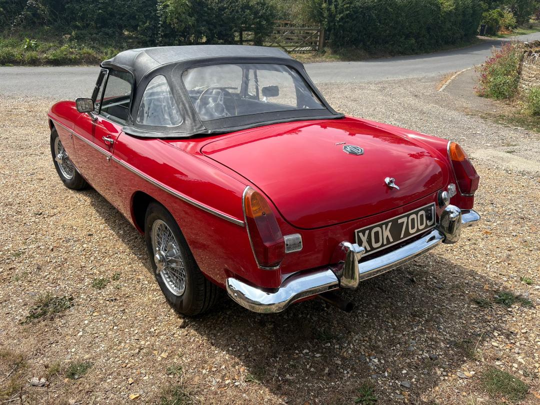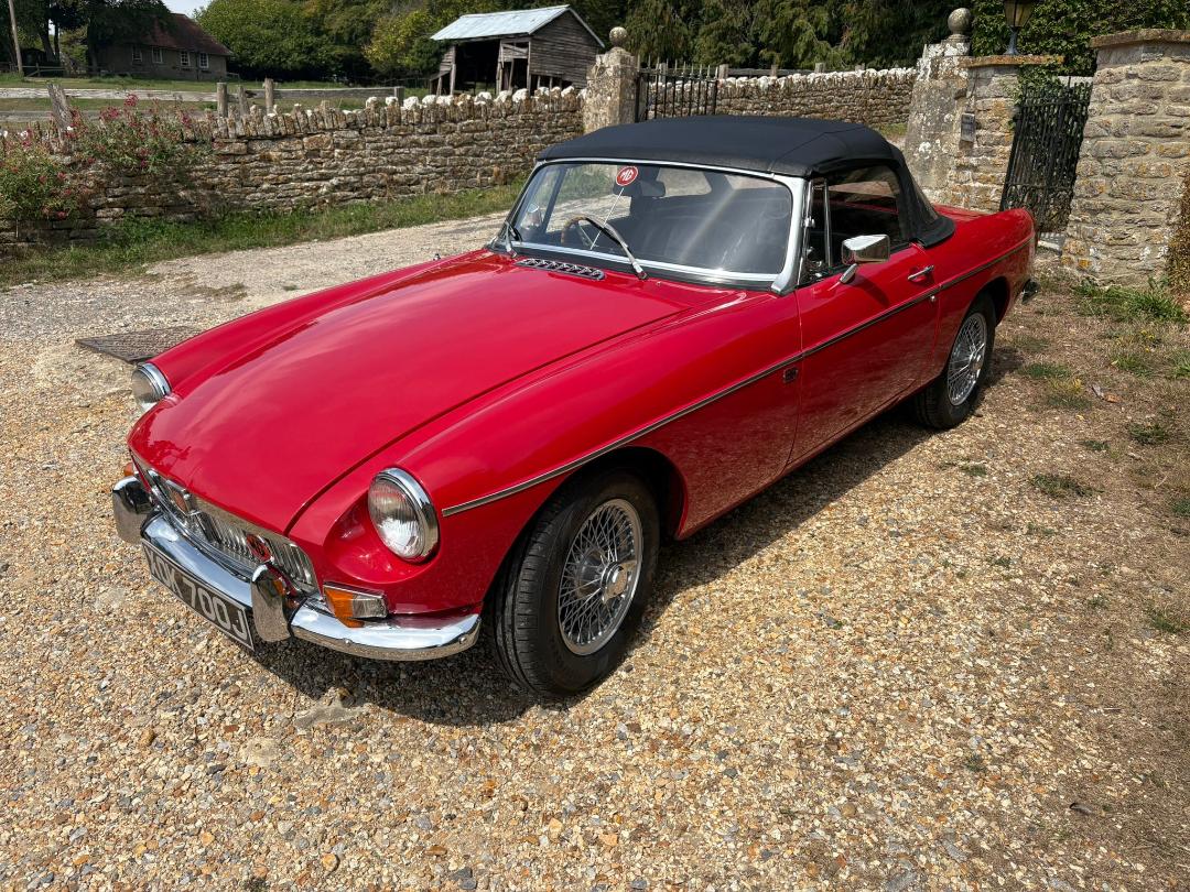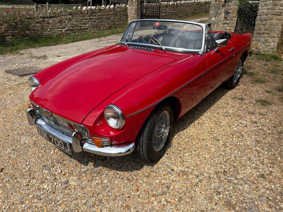 MGB Roadster, 1971, Finished in Red and comes with Overdrive, freshly painted wire wheels with new tyres, Black leather seats, electronic ignition, electric cooling fan, full tonneau, good hood and History file.