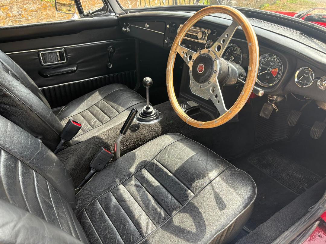MGB GT, 1970, Chrome bumper, Finished in Red, Tax and MOT exempt, it comes with black interior and seats with red piping, Motolita steering wheel, vinyl roof with full Webasto sunroof and overdrive.